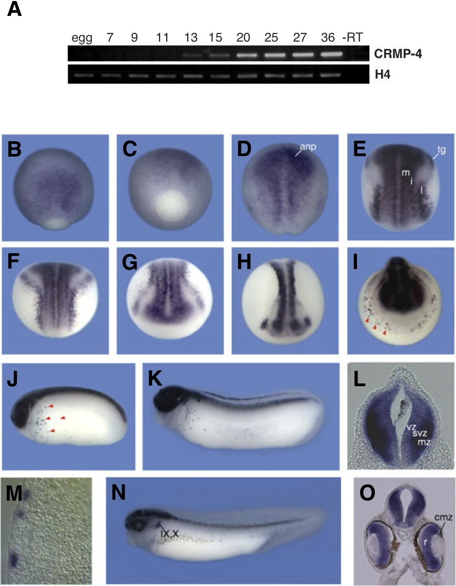 Fig. 2. Expression of Xenopus CRMP-4. (A) Temporal expression of CRMP-4 determined by RT-PCR at various stages of Xenopus development. The ubiquitous marker Histone H4 served as a loading control. (B-O) Xenopus embryos at the indicated stages were analyzed by whole mount in situ hybridization using a digoxigenin- labelled CRMP-4 antisense probe. (B) Stage 11.5 d., (C) stage 11.5, veg., (D) stage 12.5 d., (E) stage 14 d., (F) stage 15 d., (G) stage 15 ant., (H) stage 16 d-ant., (I) stage 19 ant., (J) stage 24, (K) stage 28, (L) transversal section of (K) through the spinal chord, (M) transversal section of (K) showing through the punctuate anterior-