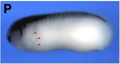 Fig. 2. (P) N-tubulin antisense probe, stage 27. Red arrowheads indicate scattered cells.