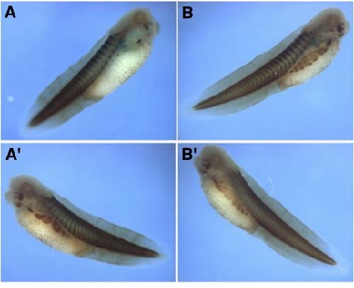 Fig. 4 (Left). Rescue of hypaxial muscle differentiation. Embryos were injected into one side with MyoS-MO (20 ng) or MyoS-MO plus MyoS mRNA (0.5 ng); the injected side was marked by lacZ RNA. Embryos were stained with 12/101 antibody and for β-galactosidase. (A) MyoS-MO, injected side (3/16 or 20% of embryos showed medium to strong staining, 13/16 weak to negative staining); (A uninjected side (16/16 strong staining). (B) MyoS- MO plus mut-MyoS mRNA, injected side (8/13 or 60% medium to strong staining, 5/13 weak to negative); (B uninjected side (13/13 strong staining).