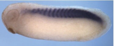 myos (myoskeletin) gene expression in Xenopus laevis embryo via in situ hybridization, NF stage 24, lateral view, anteriorleft, dorsal up.