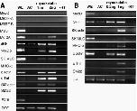 Fig. 5 (Right). MyoS induces muscle genes in animal explants. MyoS RNA was injected into the animal region of 2-cell embryos, animal caps were dissected at blastula, cultured to equivalent stage 12.5 and the expression of various genes was assayed by RT-PCR. In (A), 1 and 2ng mRNA was injected per embryo, in (B) the doses were 0.2 and 1ng. AC, uninjected animal caps; -RT, without reverse transcriptase.