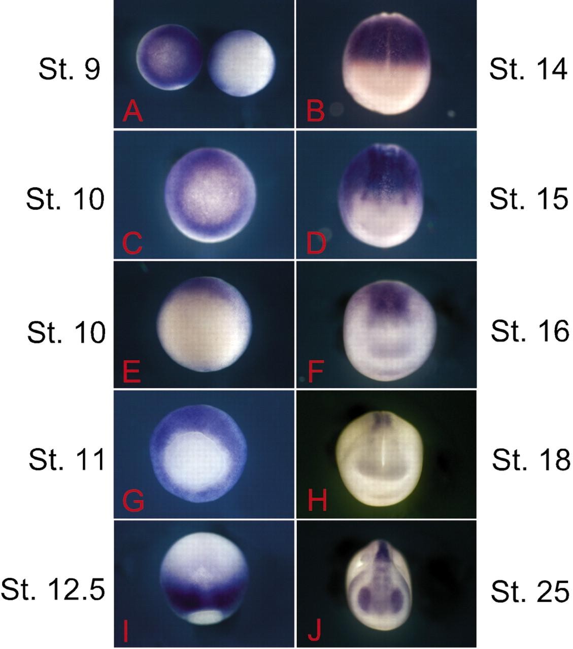 Fig. 1. Developmental expression of XRARα. Whole-mount in situ hybridization was performed on embryos from stage 9 to stage 25 using a probe that recognizes all isoforms of XRARα. (A) Dorsal (left) and ventral (right) view of a stage 9 embryo. (B,D,F,H,J) Frontal views. (C) A dorsal view of the stage 10 embryo. (E) A vegetal view of the stage 10 embryo. Note the sharp anterior border of strong staining.
