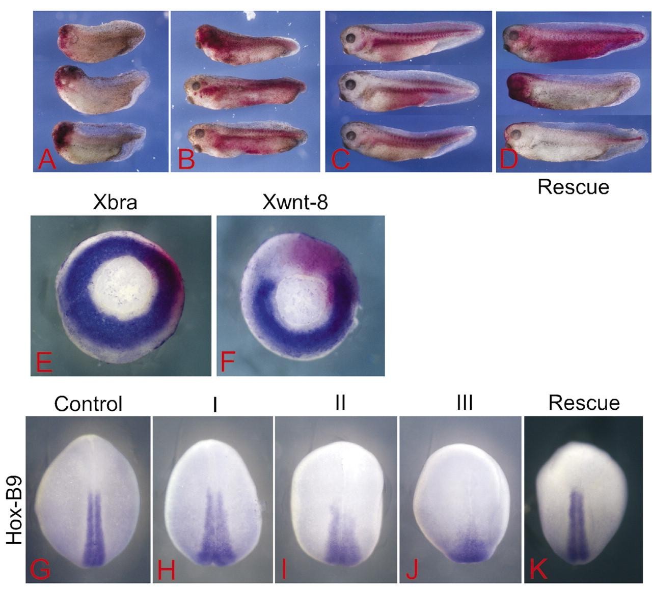 Fig. 2. XRARα2.2 loss-of-function leads to axial truncations and reduction of HOXB9 expression. (A-D) Microinjection of RAR-MO causes anterior and posterior truncations at highest frequency when expressed in the head region (A) or dorsally (B). (C) Phenotypes are mild to undetectable when the lineage tracer is distributed laterally or ventrally. (D) Phenotypes are rescued by co-injection of XRARα2 mRNA, irrespective of where the lineage tracer is located. (E,F) Neither XBRA (E) nor XWNT8 (F) expression is affected by RAR-MO injection. (G-K) Effects of RAR-MO on the expression of HOXB9. (H-J) The types of phenotypes obtained. (K) HOXB9 expression was restored by co-injecting XRAR mRNA and RAR-MO.