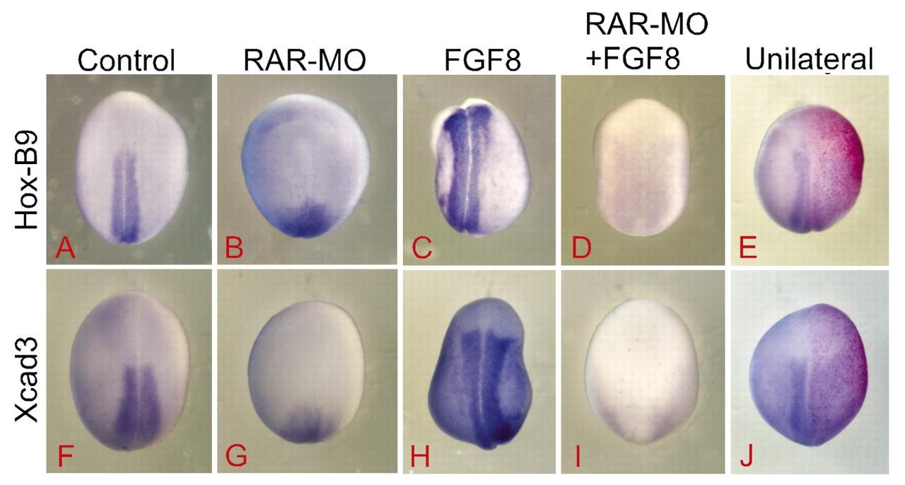 Fig. 4. FGF8 cannot rescue the effects of XRARα2.2 loss-of-function on posterior marker genes. Embryos were microinjected at the two-cell stage with the indicated reagents, allowed to develop until controls reached stage 18 and processed for whole-mount in situ hybridization with either HOXB9 (A-E) or XCAD3 (F-J) probes.