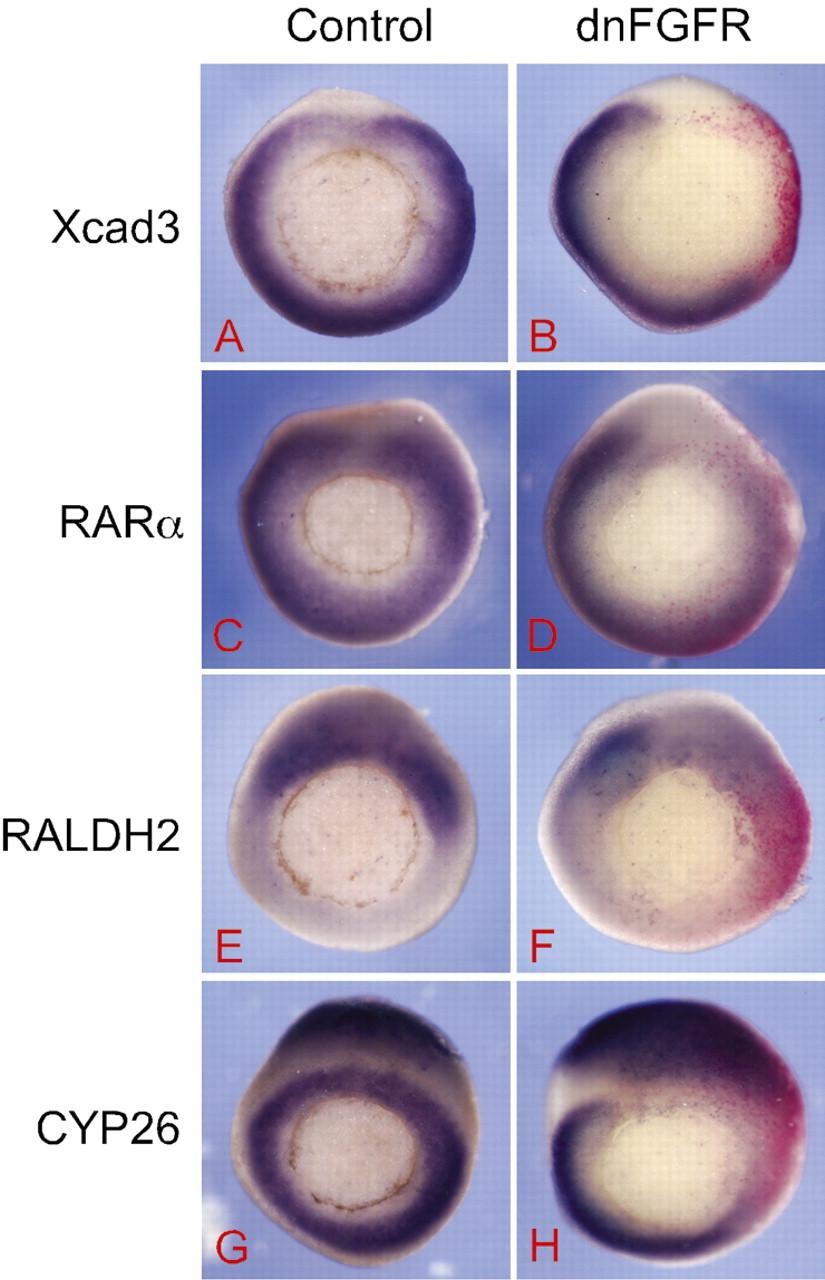 Fig. 6. FGF gene loss of function alters the expression of RAR signaling pathway components in microinjected embryos. Embryos were microinjected unilaterally into one blastomere at the two- or four-cell stage with 1 ng of XFD mRNA and β-galactosidase mRNA as lineage tracer. Embryos were allowed to develop until controls reached stage 11 then fixed and processed for whole-mount in situ hybridization with the probes (A,B) XCAD3 [cdx4], (C,D) XRARα [rara], (E,F) RALDH2 [aldh1a2] or (G,H) CYP26 [cyp26a1].
