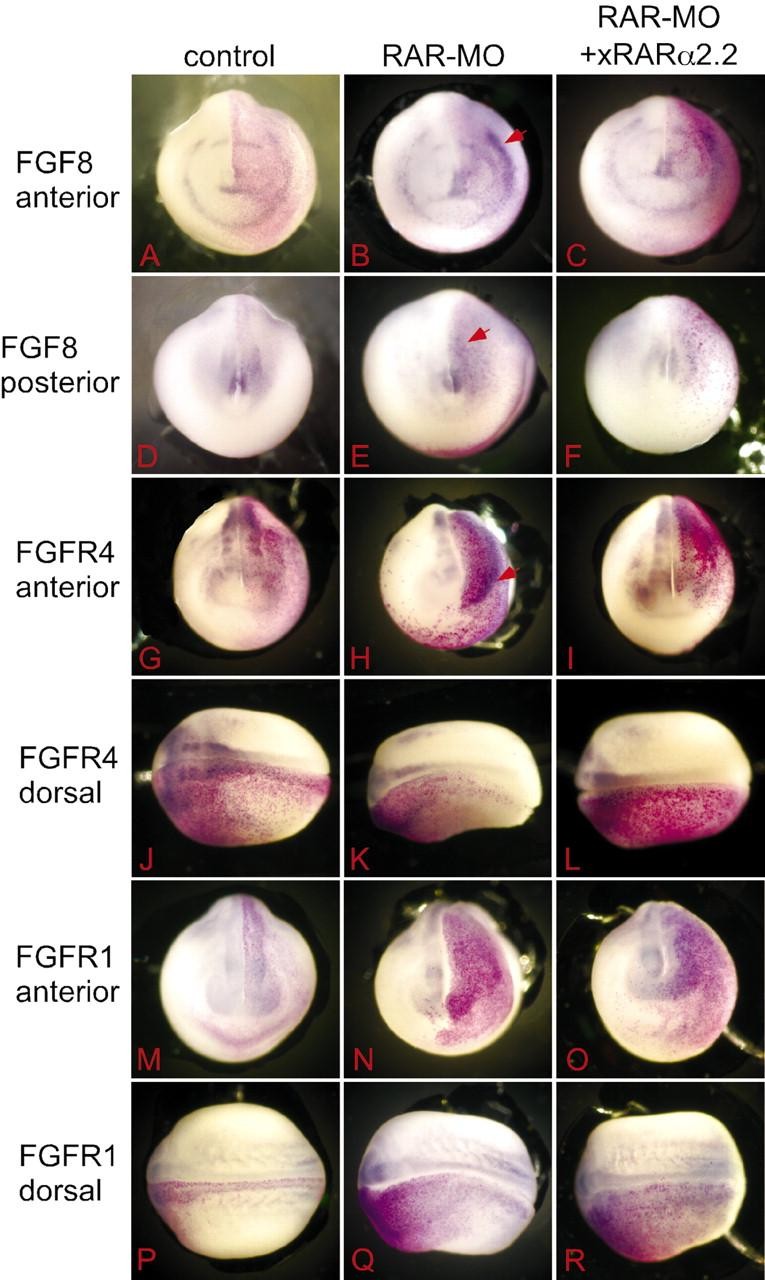 Fig. 8. XRARα2.2 loss-of-function alters the expression of FGF8, FGFR4 and FGFR1. Embryos were microinjected unilaterally with β-galactosidase mRNA plus 10 ng RAR-MO or 10 ng RAR-MO plus 1 ng XRARα2 mRNA. Embryos were fixed when control uninjected embryos reached stage 18, stained for β-galactosidase activity and then processed for in situ hybridization with FGF8 (A-F), FGFR4 (G-L) or FGR1 (M-R) probes.