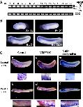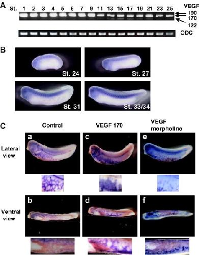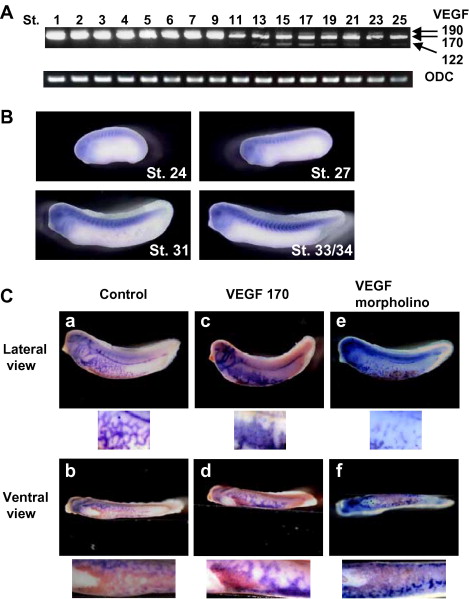 Temporal and spatial VEGF expression pattern in Xenopus embryonal development. (A) Expression of VEGF assayed by RT-PCR of total RNA prepared from the indicated developmental stages. As a control, the same samples were assayed for ODC mRNA expression. In VEGF variants, both VEGF120 and VEGF190 were seen at yolk plug stage 11. (B) VEGF mRNA distribution was analyzed by whole-mount in situ hybridization in wild-type Xenopus embryos at stage 24, 27, 31, and 33/34. Effects of VEGF170 on vascular development. (C) In situ hybridization detection of angiogenesis and hematopoiesis using Tie-2 (blue) and α-globin (brown) probes at stage 32. Control embryos (a and b), embryos injected with VEGF170 (c and d) or VEGF morpholino (e and f). Lateral view of embryos (a, c, and e). Ventral view of embryos (b, d, and f) (B).