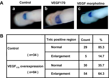 Effects of VEGF170 on cardiac development. (A) In situ hybridization with a myocardial-specific differentiation marker, TnIc. Control embryos (a), embryos injected with VEGF170 (b) or VEGF morpholino (c). (B) Score of embryos with the enlargement of the region of TnIc expression. The proportion of embryos with an enlargement heart was increased by VEGF170 mRNA injection compared with control.
