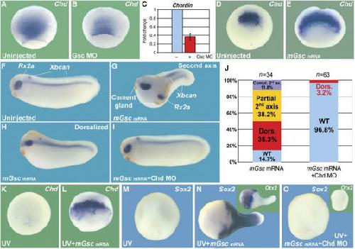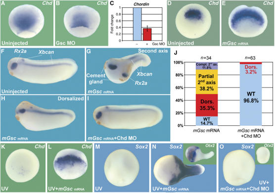 Figure 2. The dorsalizing effects of mGsc mRNA injection require Chd. (A–E) Gsc MO reduces Chd expression at gastrula 2.5-fold, whereas overexpression of mGsc mRNA greatly expands Chd expression. (F–H) Injection of 50 pg mGsc mRNA into one ventral blastomere at the four-cell stage leads to a range of dorsalized phenotypes, of which 50% develop secondary axes (38% partial; 12% complete with eyes, notochords, and cement glands). (I, J) Co-injection of Chd MO (34 ng) prevents second axis induction and dorsalization by mGsc mRNA in 97% of the embryos. (K, L) mGsc mRNA microinjection (200 pg total) induces Chd expression in UV-ventralized embryos at gastrula. (M–O) The rescue of head (Otx2) and pan-neural marker (Sox2) in UV embryos by mGsc overexpression (n=54) has a complete requirement for Chd (co-injection of 136 ng Chd MO; n=59).