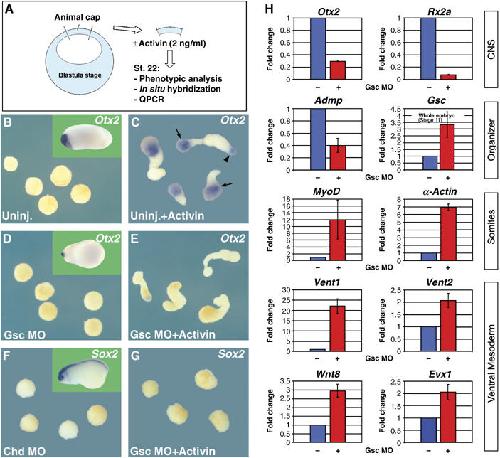 Figure 3. Gsc is required for secondary neural induction and mesoderm patterning in Activin-treated animal cap explants. (A) Experimental design (n=15 or more per experimental set) (B, C) Untreated animal caps develop into atypical epidermis, whereas Activin treatment leads to elongation and brain formation, visualized by Otx2 at the anterior pole (arrows). In addition, Otx2 expression in anterior endoderm can be seen in one of the explants (arrowhead). (D, E) Gsc-depleted caps elongate after treatment with Activin, but lack Otx2 neural staining. (F, G) Chd-depleted caps treated with Activin are unable to elongate, confirming the requirement of Chd for dorsal mesoderm and neural induction by Activin (Oelgeschläger et al, 2003). Insets show whole sibling embryos. (H) Quantitative RTâPCRs showing genes affected by depletion of Gsc include markers of anteriorCNS, organizer, somites, and ventral mesoderm. Note that Vent1 expression is increased more than 20-fold by Gsc knockdown.