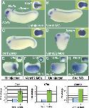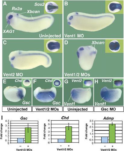 Figure 4. Double depletion of Vent1 and Vent2 causes severe dorsalization of the embryo. (A–D) Injection of either Vent1 or Vent2 MO expands the neural plate at neurula stage (insets), but only the combination of both MOs strongly dorsalizes tailbud stage embryos, with shortened body axes and large heads and cement glands (n=122; Supplementary Table I). (E, F) Vent1/2 depletion leads to transcriptional upregulation of Gsc (hemisections at stage 10; n=15) and Chd (insets in panels E and F; whole embryos, vegetal view; n=18). (G, H) Loss of Gsc increases Vent1 and Vent2 expression (hemisections at stage 10; n=21 and 15) (I) Quantitative RT–PCR analyses showing 3- to 4-fold upregulation of the organizer genes Gsc, Chd, and Admp in animal caps at gastrula stage after Vent1/2 depletion.