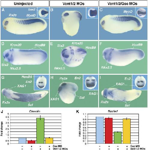 Figure 5. Gsc is required for the dorsalization caused by Vent1/2 knockdown. (A–I) Co-injection of Gsc MO restores normal pattern in Vent1/2-depleted whole embryos (n=53; Supplementary Table I). At the neurula stage, knockdown of Vent1/2/Gsc reduces the neural plate (Sox2) back to normal size (insets in panels A–C). In addition, the expansion of the cement gland and midbrain in Vent1/2 morphants is rescued in triple knockdown embyros (insets in panels G–I). Note that blood formation (Scl) is not rescued in the triple depletions (I). All MOs were injected at the same dose (45 ng each). (J) The upregulation of Chd expression by Vent1/2 MO is restored to control levels in Vent1/2/Gsc-depleted animal caps at gastrula stage. (K) Expression of Szl is downregulated by Vent1/2 MO, but restored to normal levels when Gsc is also depleted.