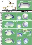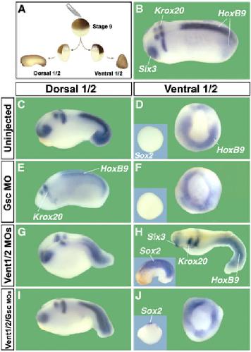 Figure 6. Knockdown of Gsc and Vent1/2 restores normal development of dorsal and ventral half-embryos (n=52 or more per experimental set). (A) Embryos were bisected into dorsal and ventral halves at blastula stage. (B) Control sibling at the same magnification as the other panels. (C, D) Bisectioned control embryos form smaller but well-proportioned dorsal half-embryos, whereas ventral halves differentiate into belly-pieces that express HoxB9 in the ventral mesoderm (Wright et al, 1990) but are devoid of neural tissue, as indicated by the lack of Sox2 expression (inset). (E, F) Gsc depletion (136 ng MO) causes a reduction of the head in dorsal halves, whereas ventral halves are not affected. (G, H) Dorsal halves of Vent1- and Vent2-depleted embryos (45 ng each) are dorsalized, but retain overall DV patterning. The corresponding ventral halves are strongly dorsalized, including expression of spinal cord (HoxB9), brain (Krox20, Six3), and pan-neural Sox2 marker (inset). (I, J) Remarkably, both halves of triple knockdown embryos (45 ng each) develop as the uninjected control half-embryos.