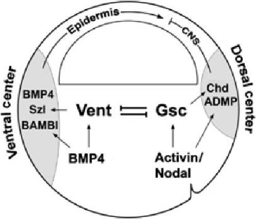 Figure 7. Model of regulatory mechanisms for pattern formation at gastrula. In the dorsal center, Activin/Nodal signals phosphorylate Smad2/3 to activate Gsc expression. The expansion of Chd and ADMP can also be achieved by Gsc-independent pathways. In the ventral center, BMP4/7 signals phosphorylate Smad1/5/8 and lead to the expression of Vent1/2. BMP4 is also able to activate ventral center secreted proteins by Vent-independent mechanisms. The function of Gsc and Vent is to regulate each other, providing an intracellular compensatory mechanism that works in concert with the extracellular networks of growth factors and their antagonists.