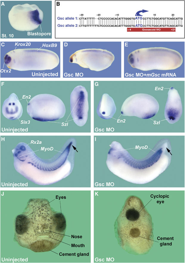 Figure 1. Gsc knockdown in Xenopus embryos causes loss of head structures and affects patterning of the AP and DV axes. (A) Gsc marks Spemann organizerendomesoderm at early gastrula. (B) Gsc MO targets both pseudoalleles of the X. laevis Gsc gene. (CâI) Gsc MO injection (136 ng total) causes loss of head structures, marked by Otx2 (forebrain), Six3 and Rx2a (forebrain and eyes), and En2 (midbrain/hindbrain border) (n=106; Supplementary Table I). Expression of the ventral marker Szl is reduced anteriorly and expanded posteriorly in the ventral blood island. (E) Co-injection of mGsc mRNA (200 pg total, radial injection) rescues the Gsc MO phenotype (n=78). (H, I) Knockdown of Gsc reduces head size and affects patterning of the posterior somites, including loss of MyoD expression at the tip of the tail (arrows). (J, K) Moderately affected embryos survive until tadpole stage and have cyclopic eyes (indicating holoprosencephaly) and no mouth opening.