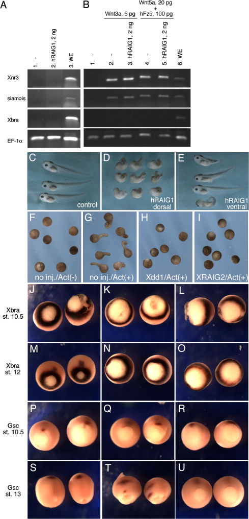 Functional analysis of overexpression of RAIG in Xenopus embryos. (A,B) Animal caps were excised from embryos injected with various combinations of mRNA as indicated. The explants were cultured until control sibling embryos reached stage 10.5, and total RNAs were isolated and subjected to RT-PCR analysis. (C) Normal un-injected tadpoles. (D) Both dorsal blastomeres of four-cell embryos were injected with hRAIG1 mRNA (1 ng). Embryos display severely reduced tail structures and kinked trunks. (E) Ventral injection of hRAIG1 mRNA (1 ng). (FâI) Activin-dependent animal cap elongation assay. Animal cap control explants from uninjected embryos were treated with (G) or without (F) activin. One nanogram of Xdd1 mRNA (H) or 200 pg of XRAIG2 mRNA (I) were injected into embryos, and the animal cap explants were treated with activin. (JâU) Expression of Xbra (JâO) and Gsc (PâU) in uninjected (J, M, P, and S), 1 ng of Xdd1-injected (K, N, Q, and T), and 1 ng of XRAIG2-injected (L, O, R, and U) embryos was examined at the indicated stage by whole-mount in situ hybridizastion. XRAIG2-injected embryos showed normal expression of mesodermal Xbra and dorsal Gsc at stage 10.5. At stage 12, the blastopore size of XRAIG2-injected embryos (O) was larger than that of uninjected (M), and the Xbra-positive cells at the involuting notochord (M) was missing in the XRAIG2-injected embryos (O). Gsc expression in control embryos at stage 13 is observed in anterior mesoendoderm far from the closed blastopore (S), but remained in a dorsal region close to the open blastopore in XRAIG2-injected embryos.