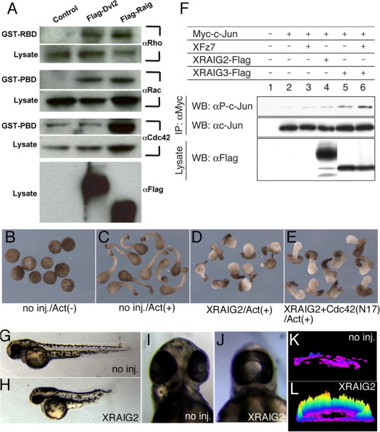 Signal transduction by XRAIGs. (A) Flag-Dvl2 or XRAIG2 was transfected to HEK 293T cells. GTP-bound RhoA in cell lysates was precipitated using GST-RBD and detected by an anti-RhoA antibody. GTP-bound Rac and Cdc42 were precipitated using GST-PBD and detected by an anti-Rac or an anti-Cdc42 antibody, respectively. (BâE) Activin-dependent animal cap elongation assay. Animal cap control explants from uninjected embryos were treated with (C) or without (B) activin. Injection of XRAIG2 mRNA (200 pg) blocked the activin-induced elongation of animal cap explants (D). Dominant-negative form of Cdc42 (200 pg) partially rescued the elongation inhibited by XRAIG2 injection (E). (F) The Myc-tagged c-Jun mRNA (200 pg) was co-injected with XFz7 mRNA (1 ng), XRAIG2 mRNA (500 pg), or XRAIG3 mRNA (500 pg). Myc-c-Jun was immunoprecipitated with anti-Myc antibody, and the immunoprecipitates were immunoblotted with anti-phospho-c-Jun antibody (top panel) or anti-c-Jun antibody (middle panel). (GâH) Phenotypes of wild-type (G,I) and XRAIG2-injected (H,J) zebrafish. (K,L) Ca2+ release dynamics in un-injected (K) and XRAIG2-injected (L) zebrafish embryos.