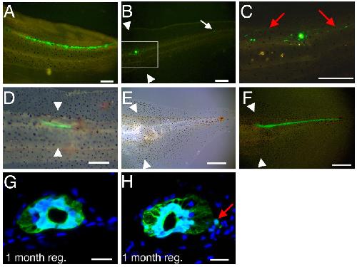 RESULTS: Labelling of the spinal cord by electroporation, or by orthotopic grafting of transgenic tissue expressing GFP, shows that no cells emigrate from the spinal cord in the course of regeneration. There is very limited regeneration of the spinal ganglia, but new neurons as well as fibre tracts do appear in the regenerated spinal cord and the regenerated tail also contains abundant peripheral innervation.The regenerated tail contains a normal density of melanophores. Cell labelling experiments show that melanophores do not arise from the spinal cord during regeneration, nor from the mesenchymal tissues of the skin, but they do arise by activation and proliferation of pre-existing melanophore precursors. If tails are prepared lacking melanophores, then the regenerates also lack them.