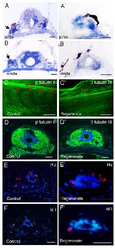 Figure 3. Expression of neural markers in spinal cord of normal and regenerating tails. (A-B') In situ hybridization detection of mRNA expression of p75a (A, A') and Brn3a (B, B') on transverse sections. (A-B) Control tails. (A'-B') Tail regenerates. Arrows in (A, B) indicate ganglia and the arrow in (A') indicates a sporadic ganglion cell. (C-D') β III tubulin expression (green) in whole mount tadpole tails (C, C') and on cross sections (D, D'). (C', D') are one-month regenerates. (E-F') Expression of Hu (E, E') and islet 1 (F, F') are detected by antibody staining on transverse sections. (E, F) un-operated control, (E', F') 2 week old tail regenerates. Scale bars: 250 μm in (E, E'), 20 μm in the rest.