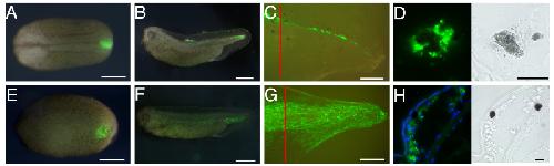 Figure 6. Tail regeneration after embryonic grafting of neural crest or of posterior ventral epidermis+mesenchyme. (A-C) A piece of GFP transgenic posterior neural crest was grafted to the same positions in wild type hosts. The labelled embryos were grown to tadpoles (B), amputated at stage 48 and allowed to regenerate for 7 days (C). Red lines indicate the amputation level. (D) A single melanophore in a regenerated tail from such an experiment, with contracted pigment and abundant GFP in the cytoplasm. (E-H) Similar experiment with graft of posterior ventral epidermis+mesenchyme (PVEM). In (H) is shown a section of the regenerate with two melanocytes, neither of which is labelled. White scale bars 500 μm; black scale bars, 20 μm.