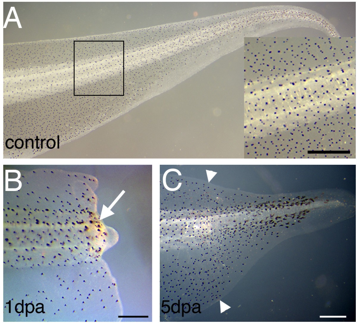 Figure 5. Regeneration of pigmentation in Xenopus tadpoles. (A) Pigment pattern of a stage 49tadpole. The inset is an enlarged view of the amputation level. (B) A regenerating tail 1 day post amputation (dpa). The white arrow indicates the melanophores near the surface. (C) A regenerating tail 5 dpa.