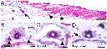 Figure 2. Morphology of the spinal ganglia viewed by haematoxylin-eosin staining. (A) A parasagittal section of the dorsal root ganglia in a stage 49 Xenopus tadpole is shown. The black arrow indicates ganglion 9. (B-D) Transverse sections of middle (B), distal (C) and regenerated (D) Xenopus tails. Arrow heads indicate the spinal ganglia in (B, C) and the arrow in (D) shows a "sporadic ganglion cell" in a regenerate. Scale bars: 500 μm in (A), 20 μm in (B-D).