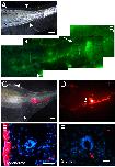 Figure 1. Tail regeneration after spinal cord labelling or grafting. (A) Electroporation of GFP plasmid into the spinal cord lumen labels some spinal cord cells. (B) GFP+ cells were observed only within the regenerating spinal cord. (C) Enlarged view of the section in (B), showing neurons with GFP+ve axons. (D-F) Spinal cord grafting in stage 48 tadpole (D) and its regeneration (E, F). GFP was only observed in spinal cord of the regenerate (F). White arrowheads indicate amputation level. Scale bars: 500 μm. (G, H) GFP expression in the regenerating tail from spinal cord-grafted tadpoles. GFP is green and nuclei are stained with DAPI (blue). In this case a single cell with GFP expression is found outside of the regenerating spinal cord (red arrow in H). Scale bars: 20 μm.