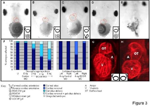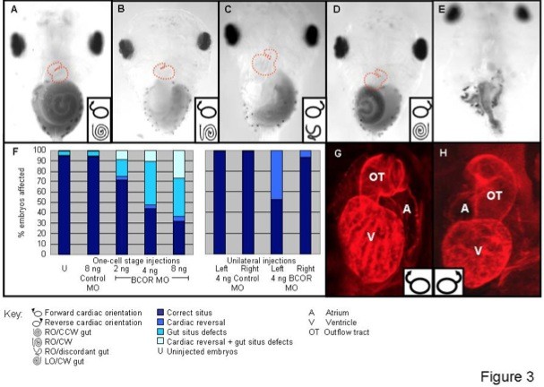 Figure 3. xtBcor MO causes defects in lateral determination. (A) Embryos injected with 8 ng of control MO were normal with only a background level of situs defects, affecting approximately 5% of embryos. (B and E). Embryos injected with 4 ng of xtBcor MO showed situs defects, manifesting as alterations to cardiac orientation and defects of gut origination and coiling (B). At high doses (8 ng), large numbers of embryos displayed a severe intestinal phenotype, with the majority of embryos displaying no anterioposterior patterning of the gut tube (E). (C and D) Unilateral left-sided injection of xtBcor MO caused cardiac and gut defects in over 85% of embryos. Cardiac development and gut patterning were uncoupled in most embryos, leading to randomized phenotypes (C). However, low numbers of embryos were observed with situs inversus phenotypes (D). In (AâD), cardiac outline/outflow tract is marked by red interrupted line. (F) Dose-dependent situs defects were observed in embryos injected with xtBcor MO (left panel). Cardiac orientation was completely randomized when xtBcor MO was injected into the left side of embryos (right panel). (G) Tadpoles injected with 8 ng control MO had no heart defects. Heart chambers were normal, with the outflow tract emerging from the left aspect of the ventricle and looping to the right. (H) Fifty per cent of tadpoles injected with 4 ng xtBcor on the left of the embryo displayed reversed cardiac orientation, with the outflow tract emerging from the right side of the ventricle and looping toward the left. No septal defects were observed in these embryos.