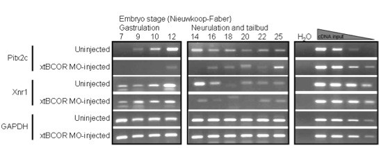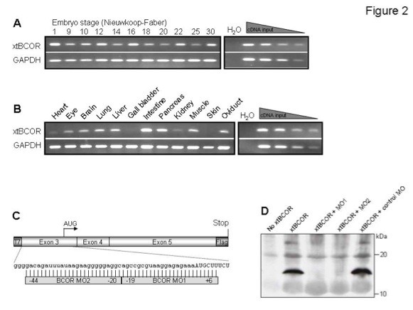 A. Temporal expression of xtBcor was examined in a cDNA series derived from pools of developmentally-staged embryos. Initially, xtBcor was shown to be expressed as a maternal mRNA. Zygotic expression was observed from stage 9, and there after throughout embryogenesis to ~stage 30.