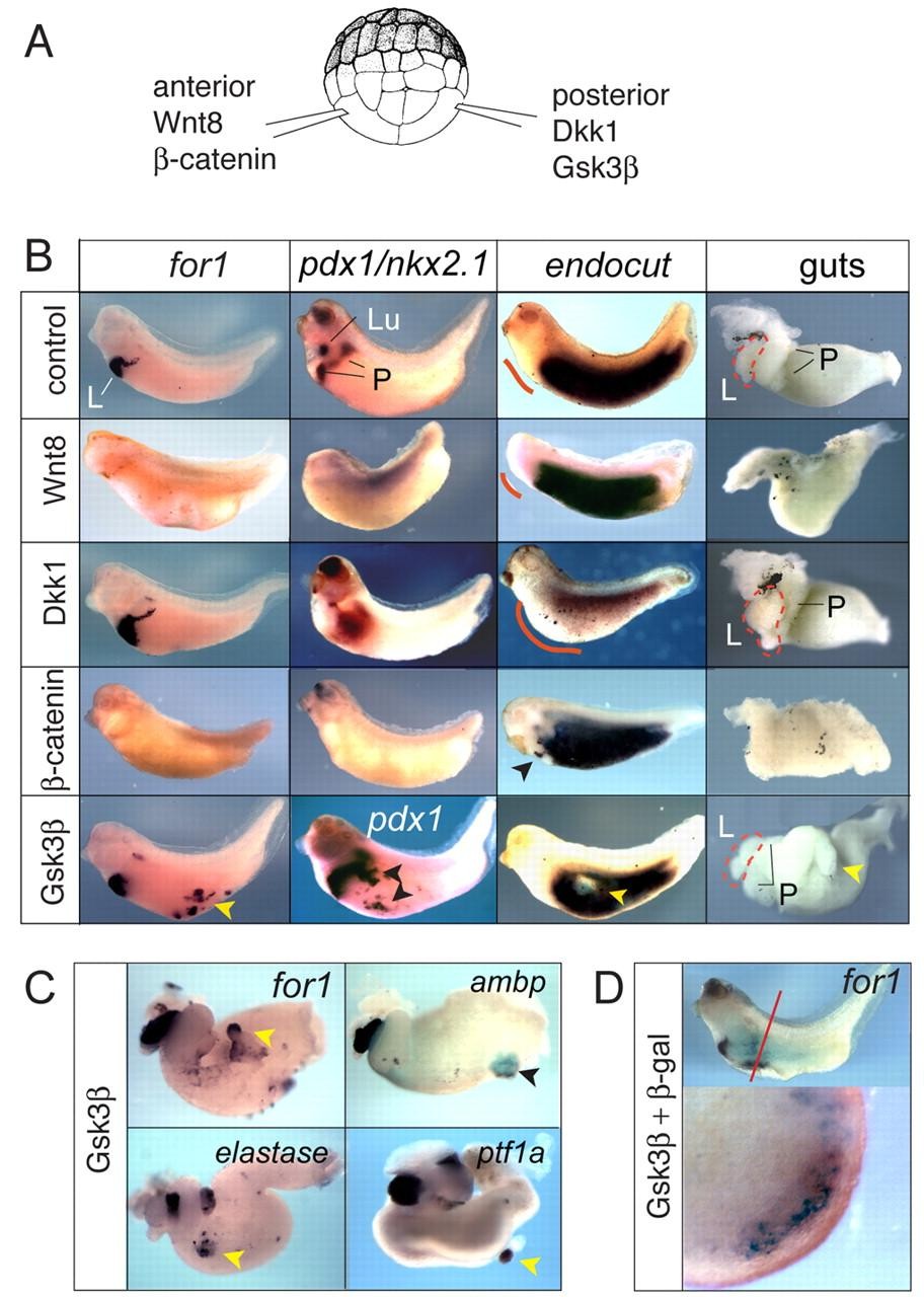 Fig. 1. Repression of β-catenin signaling in the endoderm is necessary and sufficient for liver and pancreas development. (A) 32-cell stage Xenopus embryos were injected with either a pCSKA-Wnt8 plasmid (250 pg) or stabilized pt-β-catenin RNA (250 pg) in the D1 anteriorendoderm cells. Other embryos were injected with RNA encoding Dkk1 (500 pg) or Gsk3β (500 pg) into D4 posteriorendoderm cells to repress Wnt signaling. (B) In situ hybridization at stage 35 with the liver marker for1, or with a combination of pancreas/duodenum marker pdx1/xlhbox8 and the lung marker nkx2.1, or with the intestinal marker endocut. Some embryos were hybridized with just pdx1. Arrowheads indicate ectopic or repressed gene expression. The solid red line indicates the relative size of the foregut domain. Gut tubes were isolated at stage 42 to visualize organ bud morphology. The dashed red line outlines the liver bud. L, liver; P, pancreas; Lu, lungs. (C) In situ hybridization to Gsk3β-injected guts with liver markers for1, ambp, the early pancreas marker ptf1a and the exocrine pancreas marker elastase. (D) A sectioned embryo co-injected with Gsk3β and β-gal RNA shows β-gal-staining nuclei (blue) and for1 expression (brown) localized to the endoderm.