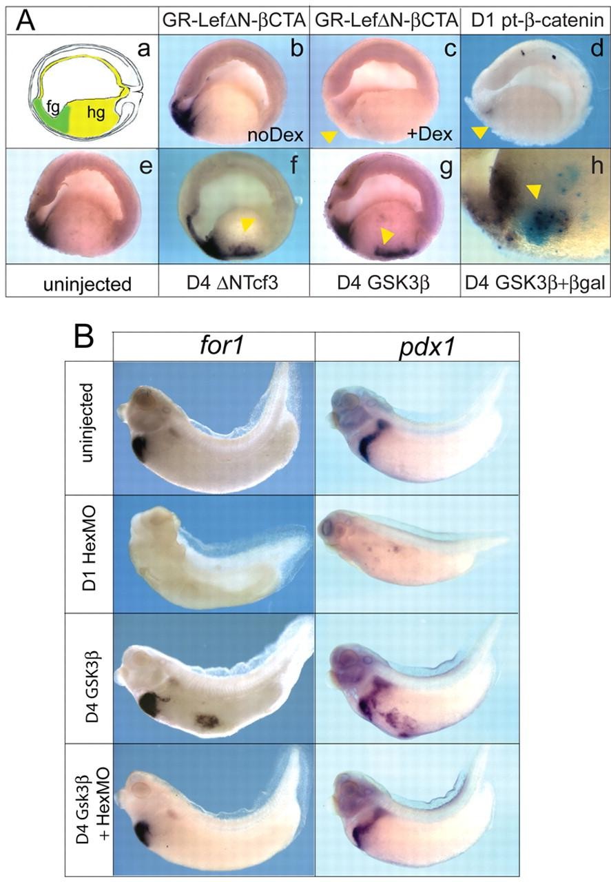 Fig. 5. Regulation and function of Xenopus hhex. (A) Analysis of hhex expression by in situ hybridization to bisected stage-18 embryos (anterior left). (a) Schematic of a stage-18 bisected embryo showing the presumptive foregut (fg, green) and hindgut domain (hg). (b) Injection of GR-LEFδN-βCTA RNA (800 pg) into the D1 anteriorendoderm cell has no effect without Dex. (c) Addition of Dex (1 μM) at the midgastrula repressed hhex expression as does (d) D1 injection of stabilized pt-β-catenin RNA (250 pg). (e) Uninjected control embryo. (f) Injection of δNTcf3 RNA (800 pg) or (g) Gsk3β RNA (500 pg) in posterior D4 cells results in ectopic hhex expression (arrowhead). (h) Co-injection of Gsk3β and β-gal RNA reveals that the blue β-gal stain co-localizes with ectopic hhex in the endoderm. (B) Hhex is required for liver and pancreas development. 32-cell stage embryos were injected with either an antisense hhex morpholino oligo (HexMO, 80 ng) in the D1 cells or with Gsk3β or Gsk3β plus HexMO in D4 cells. At stage 35, embryos were assayed by in situ hybridization with liver (for1) or pancreas/duodenum (pdx1) probes.
