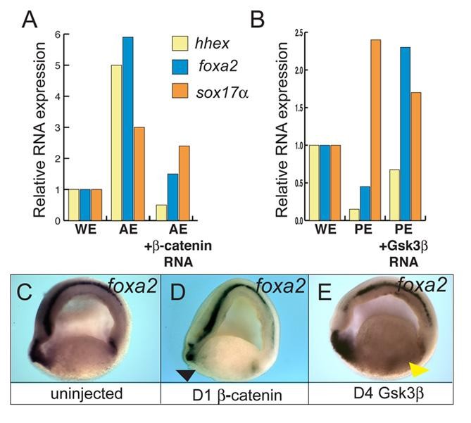 Fig. S1. β-catenin activity represses expression of foregut genes hhex and foxa2. (A,B) At the 32-cell stage, embryos were injected either (A) in the D1 cell with stabilized pt-β-catenin RNA (250 pg) or (B) in the D4 cell with Gsk3β (500 pg) to repress Wnt signaling. At gastrula stage, either anteriorendoderm (AE) or posteriorendoderm (PE) was isolated and assayed after only 4 hours by RT-PCR for expression of hhex, foxa2 and the pan-endodermal marker sox17α. Bar charts showing normalized relative mRNA expression levels. (C-E) In situ hybridization of bisected stage-18 embryos with a foxa2 probe. Xenopus foxa2 is expressed throughout the endoderm but is enriched in the foregut. (D) Injection of stabilized pt-β-catenin RNA (250 pg) in D1 at the 32-cell stage results in partial repression of foxa2 in the foregut, whereas (E) injection of Gsk3β (500 pg) in D4 upregulates foxa2 expression in the posteriorendoderm.