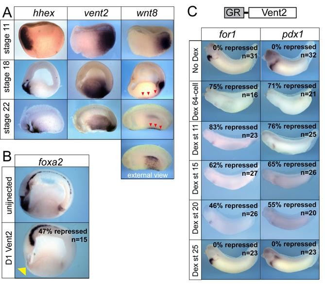 Fig. S2. Vent2 is expressed in the posteriorendoderm and can repress foregut development from blastula to early somite stages. (A) In situ hybridization of bisected Xenopus embryos (anterior left) shows that vent2 RNA is robustly expressed in the posteriorendoderm from gastrula stage 11 to stage 22, in a reciprocal pattern to hhex. Throughout this period of development, wnt8 RNA is expressed in the lateralmesoderm (red arrows) adjacent to the vent2-expressing posteriorendoderm. (B) Injection of vent2 RNA (500 pg) into the anterior D1 cells of the 32-cell stage embryo results in repression of foxa2 expression in the foregutendoderm at stage 18. (C) RNA encoding a hormone inducible GR-Vent2 fusion protein, with the hormone-binding domain of the glucocorticoid receptor fused to Vent2, was injected into the D1 anterior cells of 32-cell stage embryos. Dexamethasone (Dex, 10-6 M) was added to the media at the indicated stages, embryos were cultured until stage 35-37 and assayed by for1 and pdx1 in situ hybridization. Ectopic GR-Vent2 can repress foregut development up until stage 20, which is similar to the period when ectopically activated β-catenin can repress foregut development. No effect was observed on uninjected embryos treated with Dex, or on injected embryos without Dex.