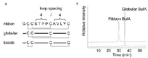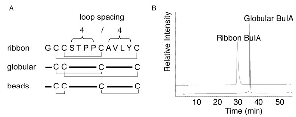 Figure 1. Disulfide isomers of BuIA. (A) A schematic representation of the ribbon, globular and beads disulfide connectivities of BuIA, a conotoxin having the unique 4/4 loop spacing. (B) HPLC traces of ribbon and globular BuIA. Analytical HPLC was carried out using a C18 Phenomenex analytical column (250 × 4.6 mm) with 90% acetonitrile and 0.043% trifluroacetic acid as the eluting solvent B and 1% B per minute as the gradient. Ribbon BuIA elutes earlier than the globular form but has a slightly broadened peak under the conditions utilized.