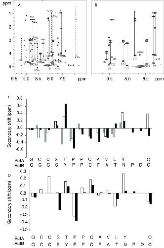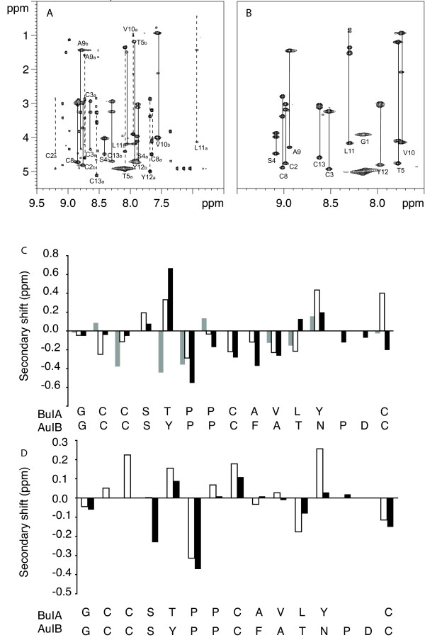 Figure 2. NMR analysis of ribbon and globular BuIA. The upper panels show the amide regions of the TOCSY spectra at 600 MHz of globular (A) and ribbon BuIA (B) at 282 K in 95% H2O/5% 2H2O at pH 3. The one letter code and the residue numbers are used for labeling. For globular BuIA (A) stretches of assigned residues are labeled, as a or b to indicate conformers A and B. The lower panels (C & D) show a secondary shift analysis of conformers A and B from globular BuIA and ribbon BuIA compared to AuIB. For each residue, represented by the one letter code, the differences between the actual chemical shifts for the α-protons and their respective random coil shifts are graphed. (C) Native AuIB (black bars), conformer A (white bars), conformer B (grey bars). (D) Ribbon AuIB (black bars), ribbon BuIA (white bars).