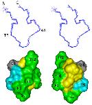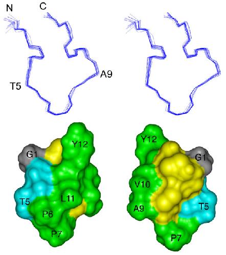 Figure 3. Three-dimensional structure of the ribbon isomer of BuIA. (top) Stereoview of the 20 NMR-derived lowest energy structures of ribbon BuIA. For clarity only the backbone (N, Cα, C') is shown and the two disulfide bonds are omitted. The structures are superimposed over the whole molecule. N refers to the N-terminus; C refers to the C-terminus. Residues were labeled with the one letter code. (bottom) Solvent accessible surface of ribbon BuIA. The two views are rotated by 180° about the vertical axis. Hydrophobic residues (Pro, Ala, Val, Leu, Tyr) are green, hydrophilic residues (Ser, Thr) are blue, Gly is grey and the Cys residues are yellow. Selected residues are labeled with the one letter code.