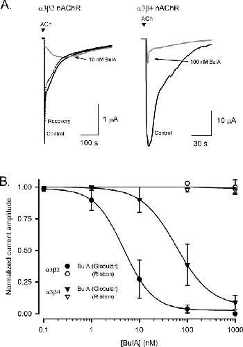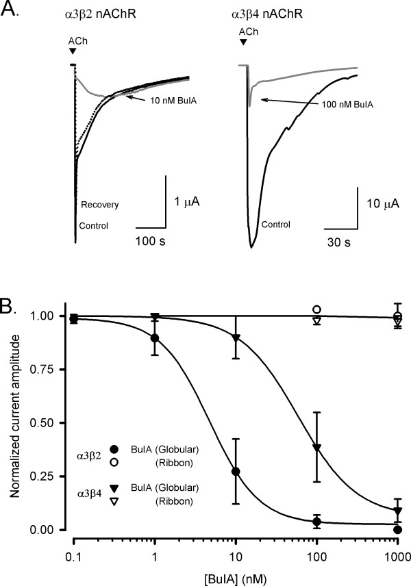 Figure 4. Effect of globular and ribbon isomers of α-conotoxin BuIA at nAChR subtypes expressed in Xenopus oocytes. (A)Representative ACh-evoked currents mediated by α3β2 and α3β4 nAChR subtypes obtained in the absence (control) and presence of 10 nM and 100 nM BuIA-globular, respectively. Complete recovery was observed after 10 min washout (broken line). (B)Concentration-response curves for the inhibition of α3β2 and α3β4 nAChRs by globular (filled symbols) and ribbon (open symbols) isomers of BuIA. Best fit of the data gave IC50 values of 4.8 ± 0.4 nM (nH = 1.3) and 59.1 ± 2.3 nM (nH = 1.2) for α3β2 and α3β4 nAChRs, respectively, whereas the ribbon isomer of BuIA exhibited no inhibition at 1 μM. Responses are shown as a percentage of ACh (100 μM)-induced peak current amplitude after a 5 min incubation of the BuIA isomers with respect to control (ACh alone). Error bars are SEM with n = 4–7 for each data point.