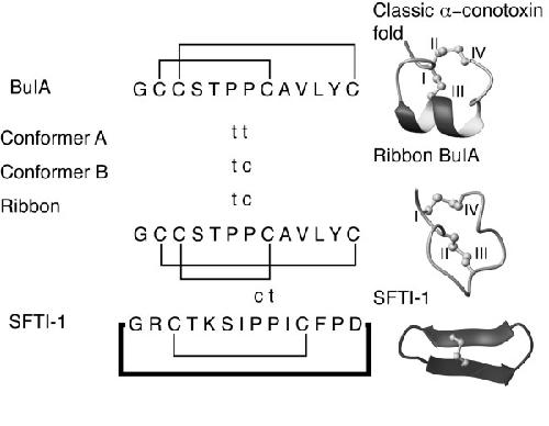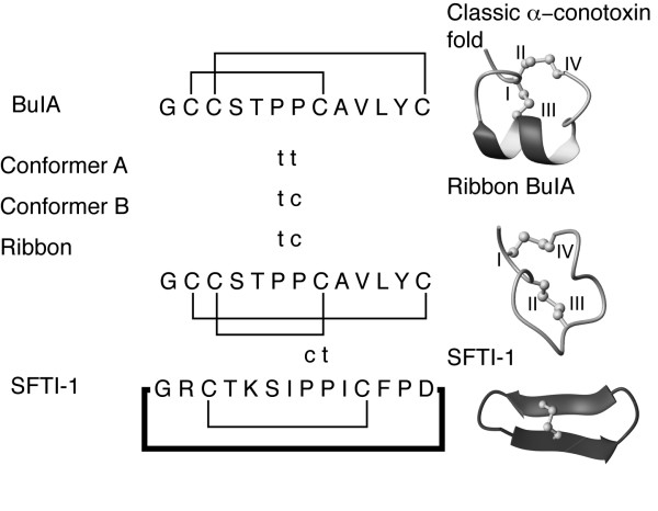 Figure 5. Proline geometries of the BuIA isomers and the sunflower trypsin inhibitor SFTI-1 [26]. The proline residues with trans geometry are marked as t and those with cis as c. The three-dimensional structures of a classic α-conotoxin, ribbon BuIA and SFTI-1 are shown to highlight the structural differences between the various peptides.