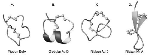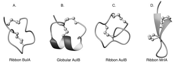 Figure 6. Backbone trace of the structures of ribbon BuIA (A), globular AuIB (B), ribbon AuIB (C), and ribbon MrIA (D). Disulfide bonds are shown as balls and sticks. The helices are shown with thickened ribbons and β-strands are indicated with arrows.