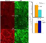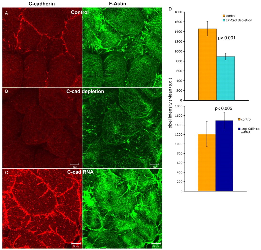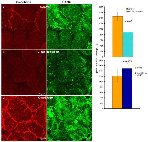 Fig. 2. The density of cortical actin depends upon the level of expression of C-cadherin at the cell surface. (A-C) Pairs of images from double-stained (C-cadherin, red; F-actin, green) animal caps. (A) Control levels of C-cadherin and cortical actin. (B) An animal cap from a Xenopus embryo depleted of C-cadherin by antisense oligo injection into oocytes. (C) An animal cap from an embryo overexpressing C-cadherin. Cortical actin is increased when C-cadherin is overexpressed and decreased when C-cadherin is depleted. (D) Quantitation of the cortical actin by measurement of pixel intensity. Scale bars: 10 μm. |