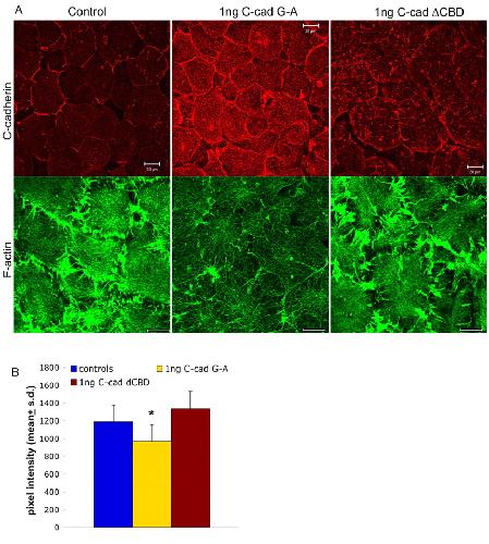 Fig. 3. Effects of C-cadherin mutants on cortical actin assembly. (A) Animal caps dissected from Xenopus embryos at stage 9 were fixed with 2% TCA for anti-C-cad immunostaining (upper row) or with FG fixative for F-actin staining (lower row). Pairs of images are shown from embryos that were untreated (Control, left), or injected with C-cad G-A (does not bind p120 catenin, center) or with C-cad δCBD (does not bind β-catenin, right). Both cadherin mutant mRNAs are expressed (see also Fig. 4). However, neither causes a significant increase in cortical actin, and the C-cad G-A mutant caused loss of cortical actin. (B) F-actin levels quantitated by pixel intensity. *, P<0.05. Scale bars: 20 μm. |