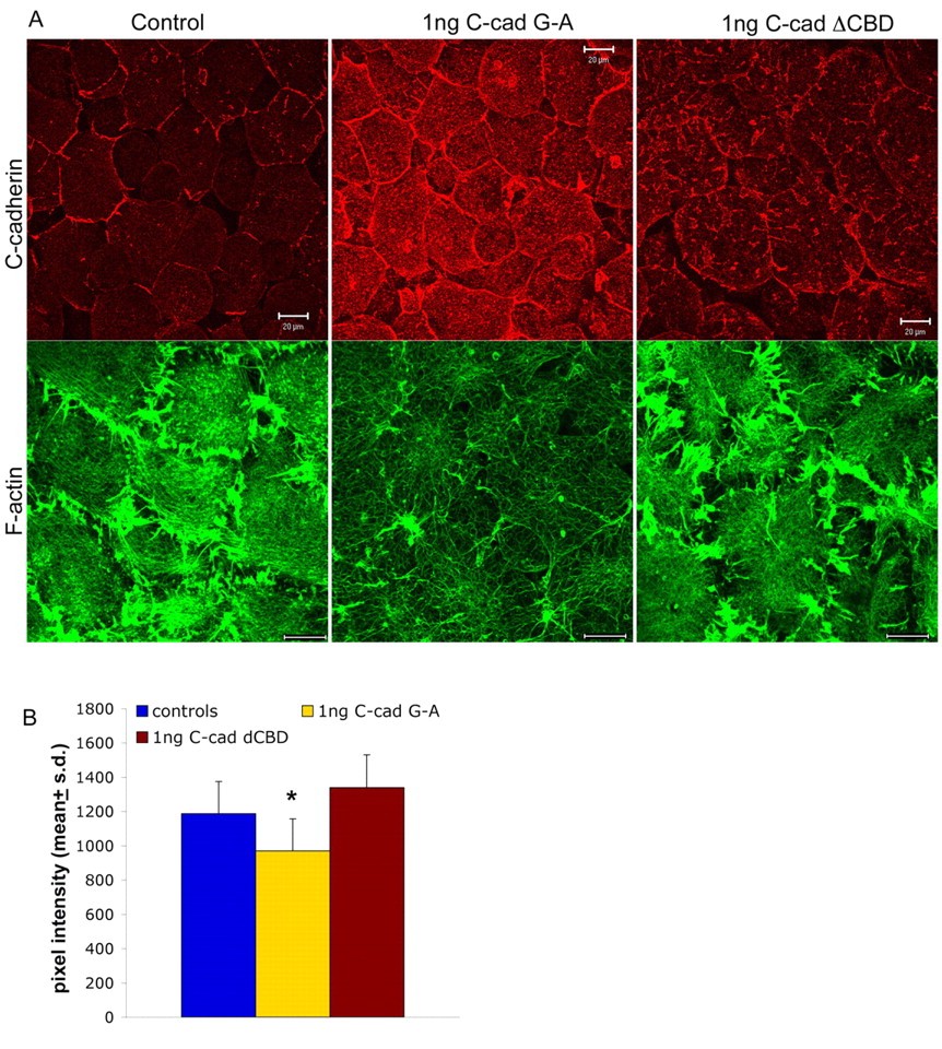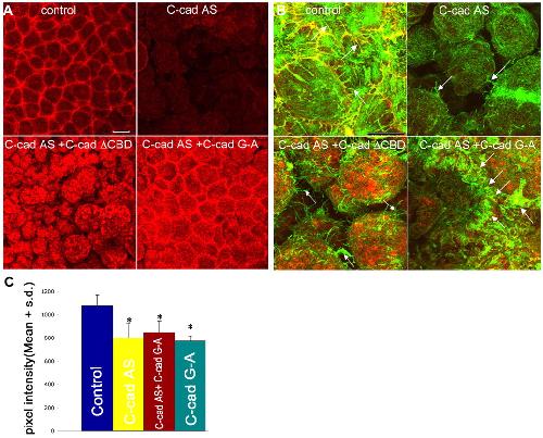 Fig. 4. The C-cad G-A mutant does not rescue dense actin assembly when endogenous C-cadherin is depleted. (A) When overexpressed, C-cad G-A was localized on the cell surface, but the C-cad δCBD mutant was trapped in the intracellular vesicles in Xenopus embryos depleted of C-cadherin. (B) F-actin (green) and C-cadherin (red) double staining shows that the C-cad G-A mutant did not rescue the dense actin assembly. Arrows denote actin-rich membrane processes. (C) Overall levels of polymerized actin quantitated by pixel intensity. *, P<0.05. Scale bars: 50 μm in A; 20 μm in B. |