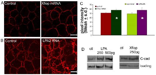 Fig. 6. Gain-of-function experiments show that the G-protein-coupled receptors Xflop and LPA2 control the level of C-cadherin on the cell surface. (A,B) Cadherin-stained animal caps from untreated animal caps (Control) and animal caps from Xenopus embryos injected with Xflop (A, right panel) or LPA2 (B, right panel) mRNA. (C) Quantitation of pixel intensity showing that both mRNAs increased the level of cadherin staining. *, P<0.05. (D) Western blot showing the increase in the total levels of C-cadherin caused by overexpression of Xflop and LPA mRNAs. α-tubulin was used as loading control. Scale bars: 20 μm. |