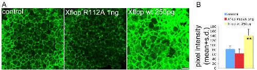 Fig. 7. Overexpression of an Xflop mutant (R112A) that lacks G-protein-coupling activity does not increase cortical actin assembly. (A) Alexa 488-conjugated phalloidin staining showing that overexpression of the R112A mutant (1 ng mRNA injected) does not mimic the capacity of wild-type Xflop to increase cortical actin assembly. (B) Quantitation by pixel intensity shows that R112A had no effect on cortical actin assembly. *, P<0.01. Scale bar: 50 μm. |