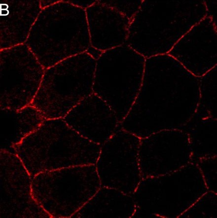 TCA-fixed animal caps were stained with an anti-C-cadherin monoclonal antibody (6B6) and visualized by Cy5-conjugated goat anti-mouse IgG. Shown here is an optical slice of a cleared animal cap imaged by LSM confocal microscope. Positive staining appears along cell-cell contacts as discrete punctae. |