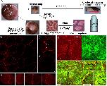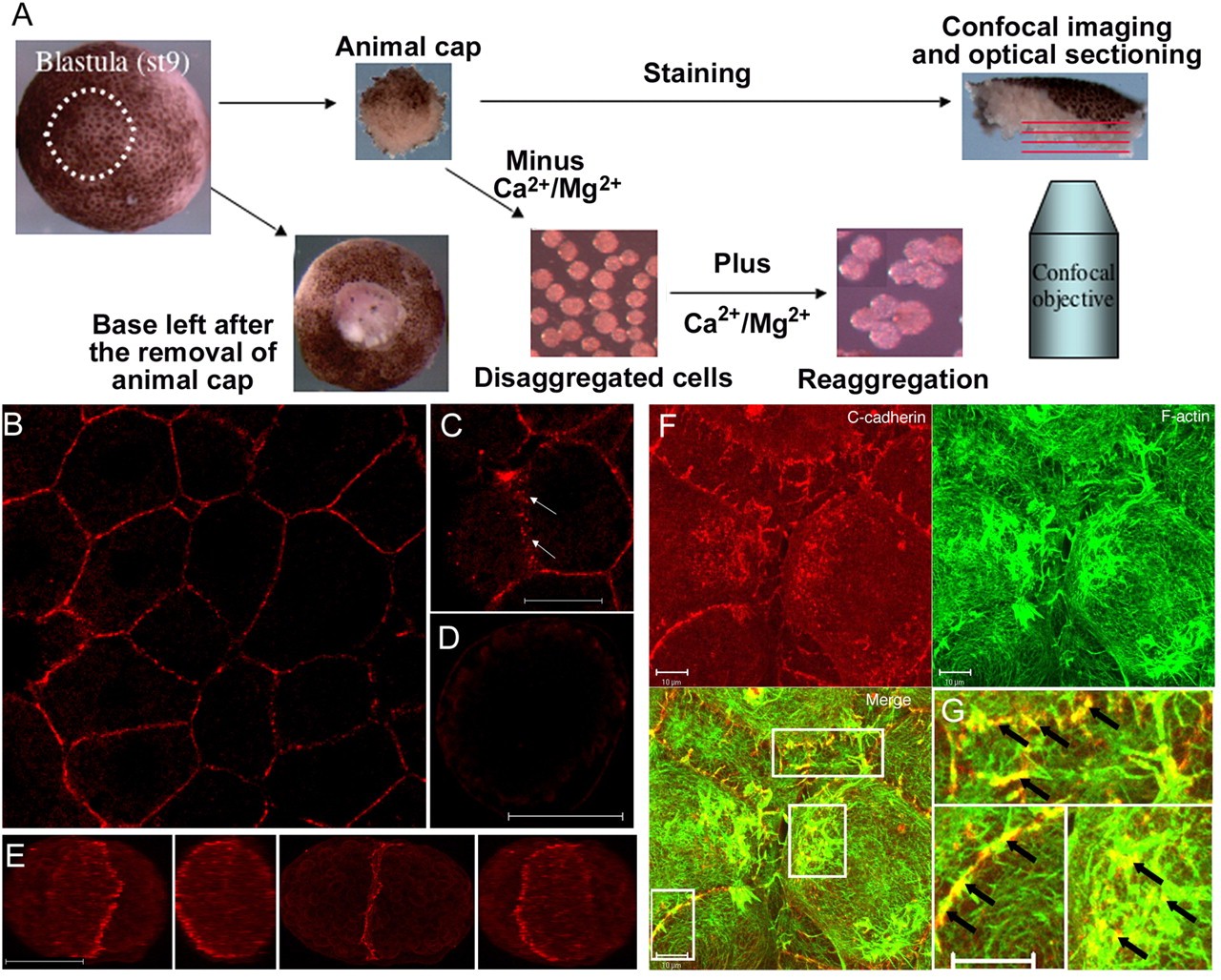 Fig. 1. Expression of C-cadherin and its colocalization with cortical actin skeleton at the late blastula stage in Xenopus. (A) The assay system used in these experiments. (B) TCA-fixed animal caps were stained with an anti-C-cadherin monoclonal antibody (6B6) and visualized by Cy5-conjugated goat anti-mouse IgG. Shown here is an optical slice of a cleared animal cap imaged by LSM confocal microscope. Positive staining appears along cell-cell contacts as discrete punctae. (C) A grazing optical section in the plane of a cell membrane shows punctae en face (arrows). (D) Cells disaggregated in calcium- and magnesium-free saline lose surface cadherin. (E) Upon addition of calcium and magnesium, cells start to reaggregate. Two aggregating cells are shown at different angles. The membranes lining the site of initial adhesion between the cells produce punctae containing C-cadherin. (F) Cells on the blastocoelic surface of the animal cap stained with monoclonal antibody 6B6 against C-cadherin (red) and phalloidin. The two images are merged in the lower-left panel. Yellow areas indicate colocalization of F-actin and C-cadherin. (G) The areas outlined in the merged image shown at high magnification. Arrows highlight colocalization of F-actin and C-cadherin. Scale bars: 20μ m in A-E; 10 μm in F,G. |