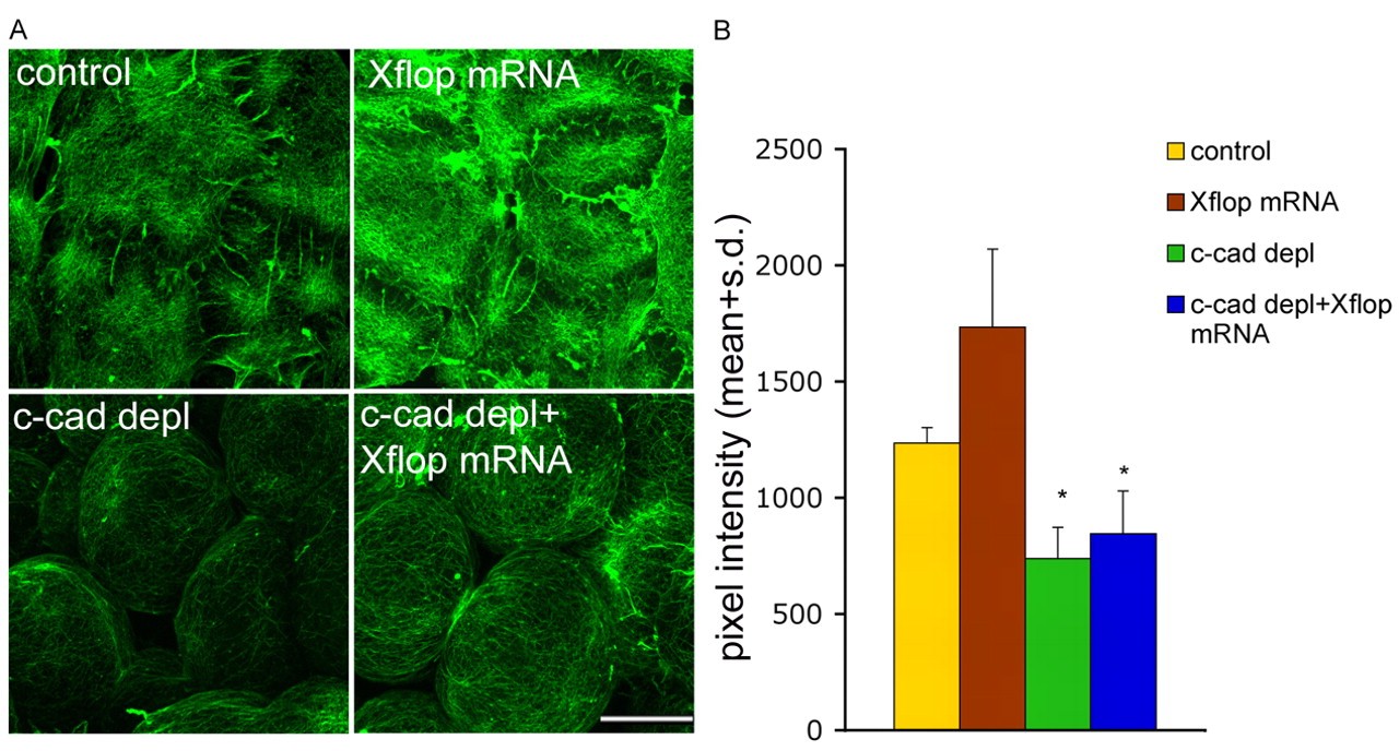 Fig. 9. Depletion of C-cadherin blocks Xflop-induced cortical actin assembly. (A) Alexa 488-conjugated phalloidin staining of F-actin shows that C-caderin depletion (c-cad depl) significantly reduces both endogenous and Xflop overexpression induced cortical actin assembly. (B) This notion is supported by pixel intensity quantitation. *, P<0.05. Scale bar: 50 μm. |