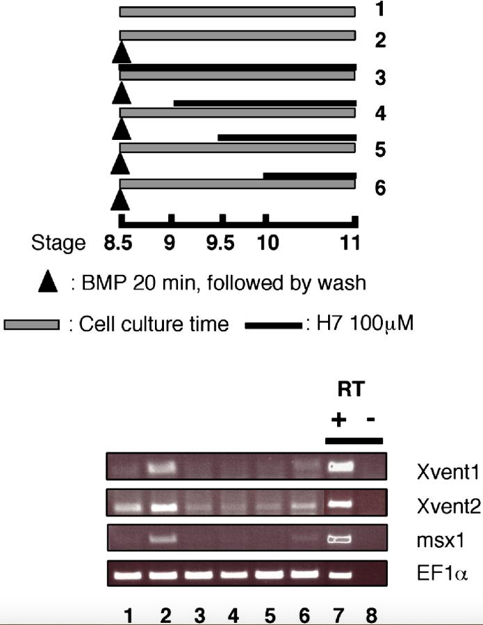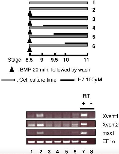 Fig. 4. A continuous BMP receptor complex activity is required for maintaining a gene response. Gene transcription is stopped in the presence of the kinase inhibitor H7. Top panel: schematic representation of experimental design for H7 treatment. Bottom panel: dissociated animal caps from four normal embryos were treated with 2 μg/ml BMP4 for 20 min at stage 8.5, and subsequently with 100 μM H7 as shown. Xvent1, Xvent2 and msx1 expression was analyzed by RT-PCR. EF1α is the loading control. |