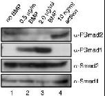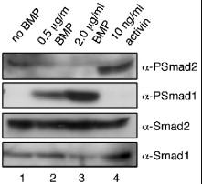 Supplementary Fig. 1. Smad2 phosphorylation is absent in BMP-treated animal cap cells. Dissociated animal cap cells were treated with 0.5 μg/ml BMP (lane 2), 2.0 μg/ml BMP (lane 3) and 10 ng/ml activin (lane 4) and analyzed using an anti-phospho-Smad1 (α-PSmad1) and anti-phospho-Smad2 antibodies (α-PSmad2). Ten dissociated animal caps were loaded per each well. Total Smad1 and Smad2 were used as loading control. |