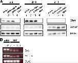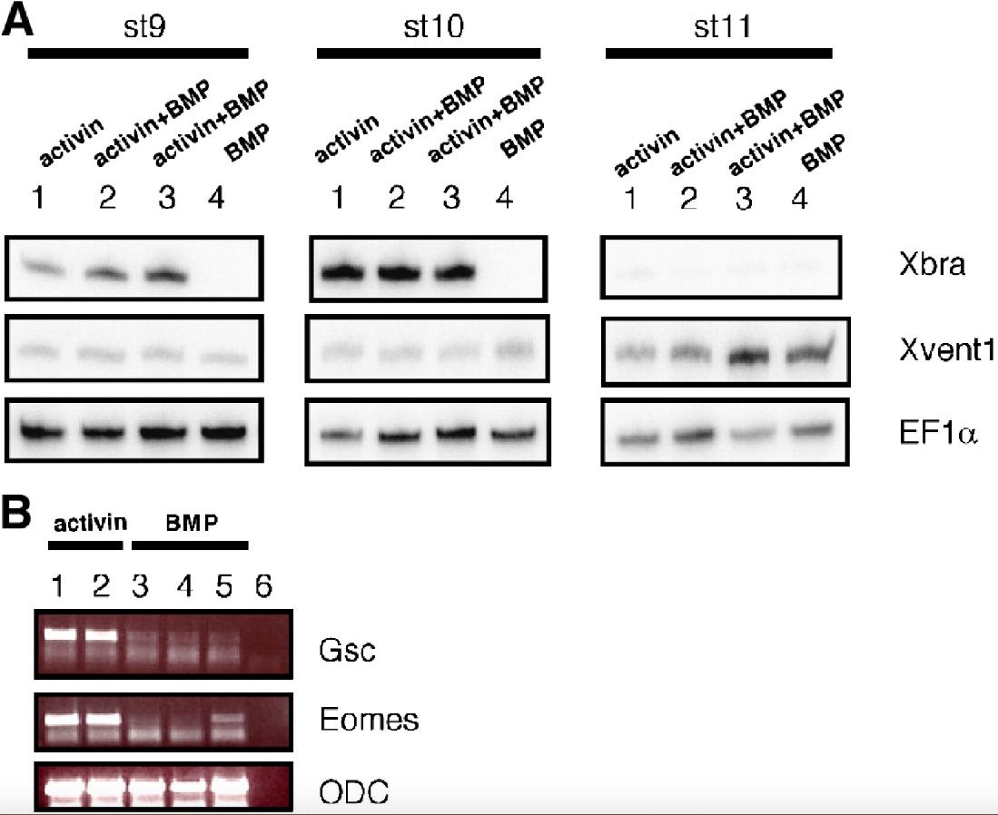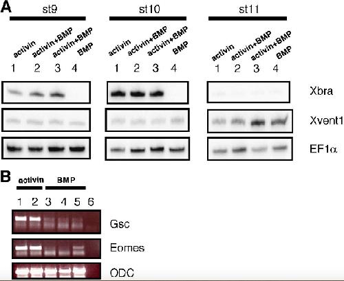 Supplementary Fig. 2. Activin target genes are not activated in the presence of BMP. (A) Xbra expression is absent in BMP-treated cells. Dissociated animal cap cells were treated at stages 9, 10 and 11 with 10 ng/ml activin (lane 1), 10 ng/ml activin + 0.5 μg/ml BMP (lane 2) and 10 ng/ml activin + 2 μg/ml BMP (lane 3) and 2 μg/ml BMP (lane 4) and frozen at stage 12. Xvent1 is used as a positive control after BMP treatment. EF1α is the loading control (B) Gsc and Eomes expression is absent in BMP-treated cells. Dissociated animal cap cells were treated with 10 ng/ml activin at stage 9 (lane 1) and 11 (lane 2), with 2 μg/ml BMP at stage 8 (lane 3), stage 9 (lane 4) and stage 10 (lane 5). Lane 6 is the PCR negative control. ODC is the loading control. |